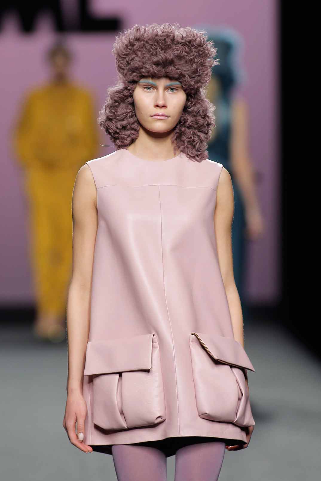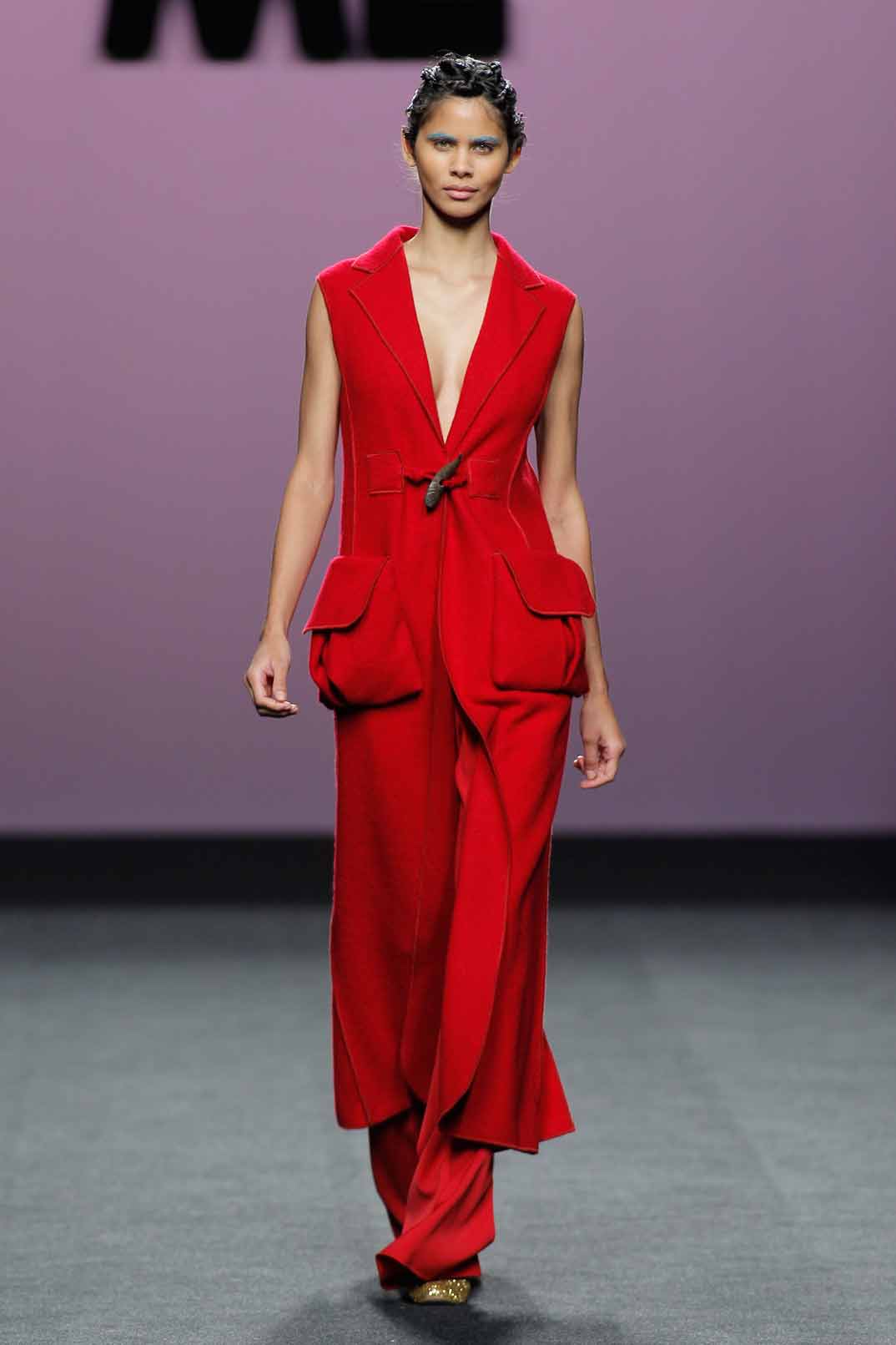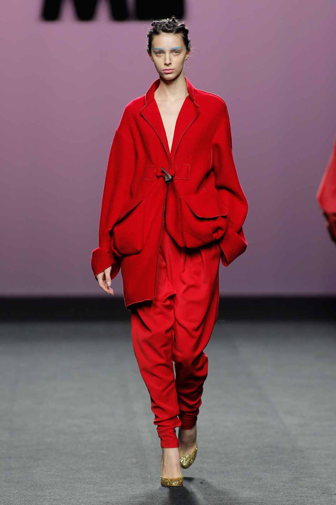 Para el día, Marcos Luengo inventa siluetas que recuerdan, por estilismos y superposición de prendas, a nómadas. Los abrigos, del mismo color que los pantalones y camisas, se expanden en mohair, lana cocina y cordero rizado. Para la noche, la paleta de color vuelve a ser igualmente explosiva en forma de vestidos cóctel con plumas con capas a juego y varios modelos de ‘twill’ elástico de terciopelo.