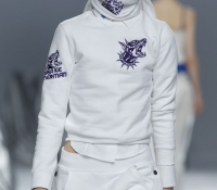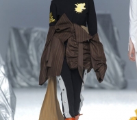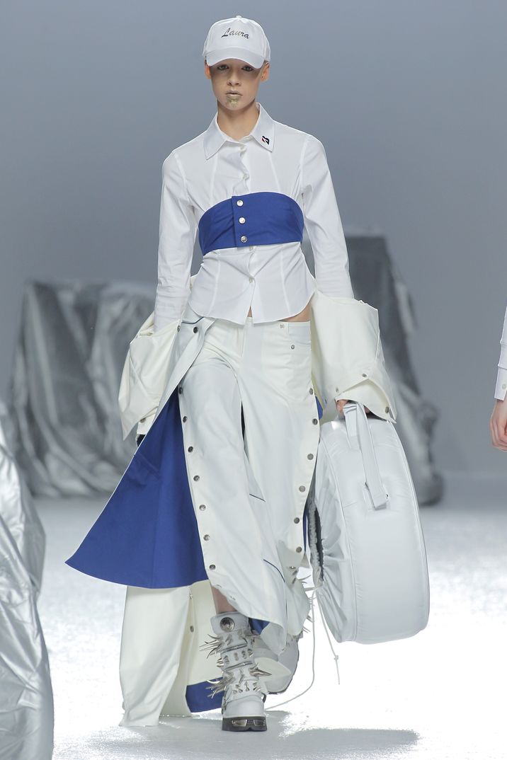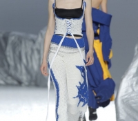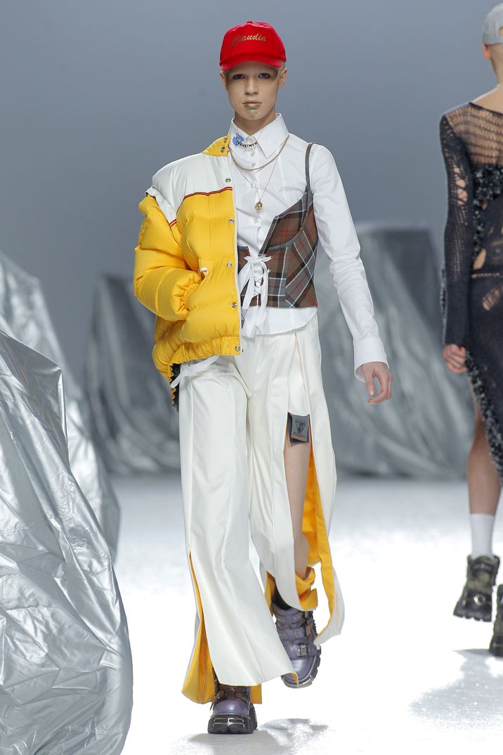Los plumíferos en amarillo y azul, con la bandera de España, conquistan la pasarela con sus diseños donde la deconstrucción de prendas y las superposiciones llegan a límites insospechados.