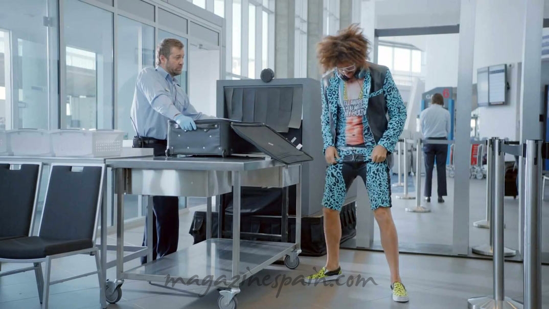 Cuando el guardia le pregunta si tiene algo más en los bolsillos Redfoo se arranca, literalmente, los pantalones.