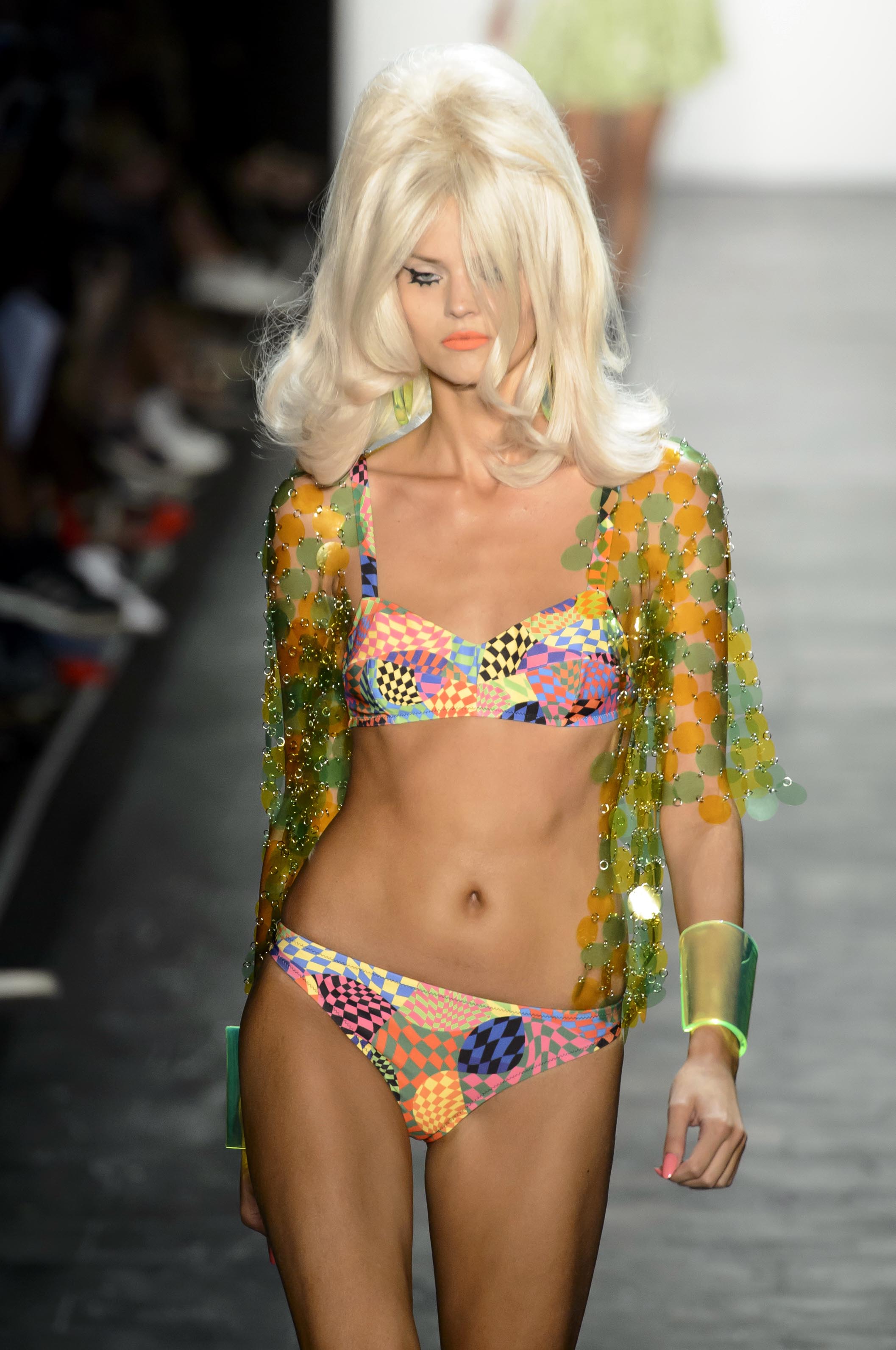 Con colección, con la que nos trasladamos a los años 80, la pasarela se llena de una infinita paleta de colores, pelucas con cardados y los estampados divertidos mientras la música de los 80 sonaba marcando el ritmo de las modelos.