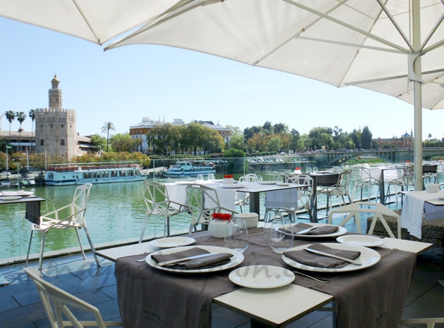 Posada sobre el mismo río Guadalquivir y con vistas a la Torre del Oro, es un espacio al aire libre amplio y cuidado, donde disfrutar de cocina de vanguardia y raíz andaluza, así como de copas y cócteles, en un amplio horario de 13’30 a 16’00 y de 21’00 a 24’00 (no cierran ningún día).