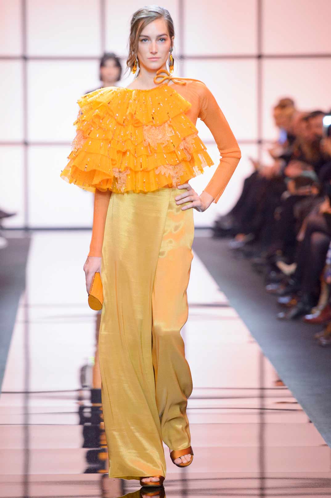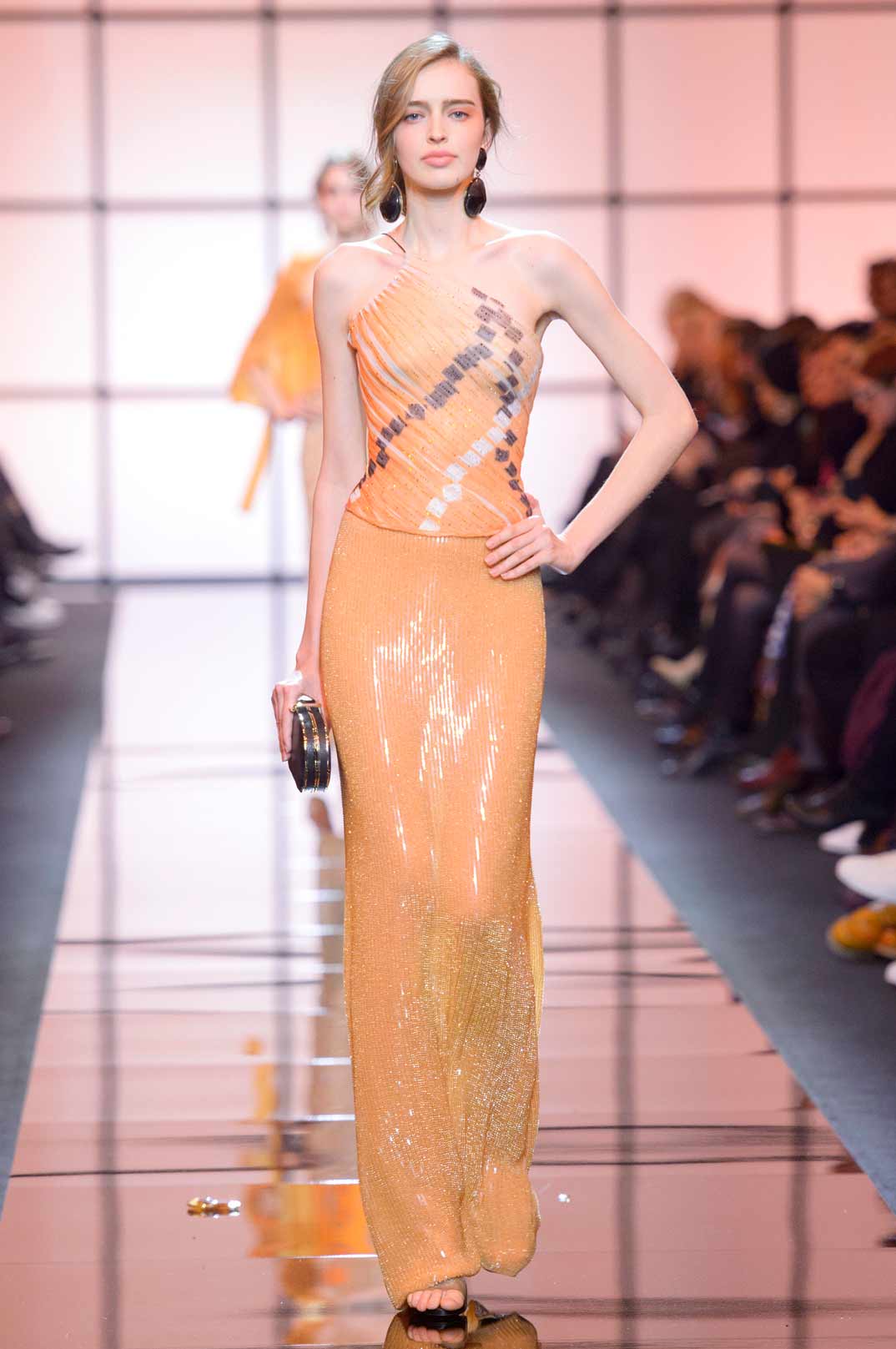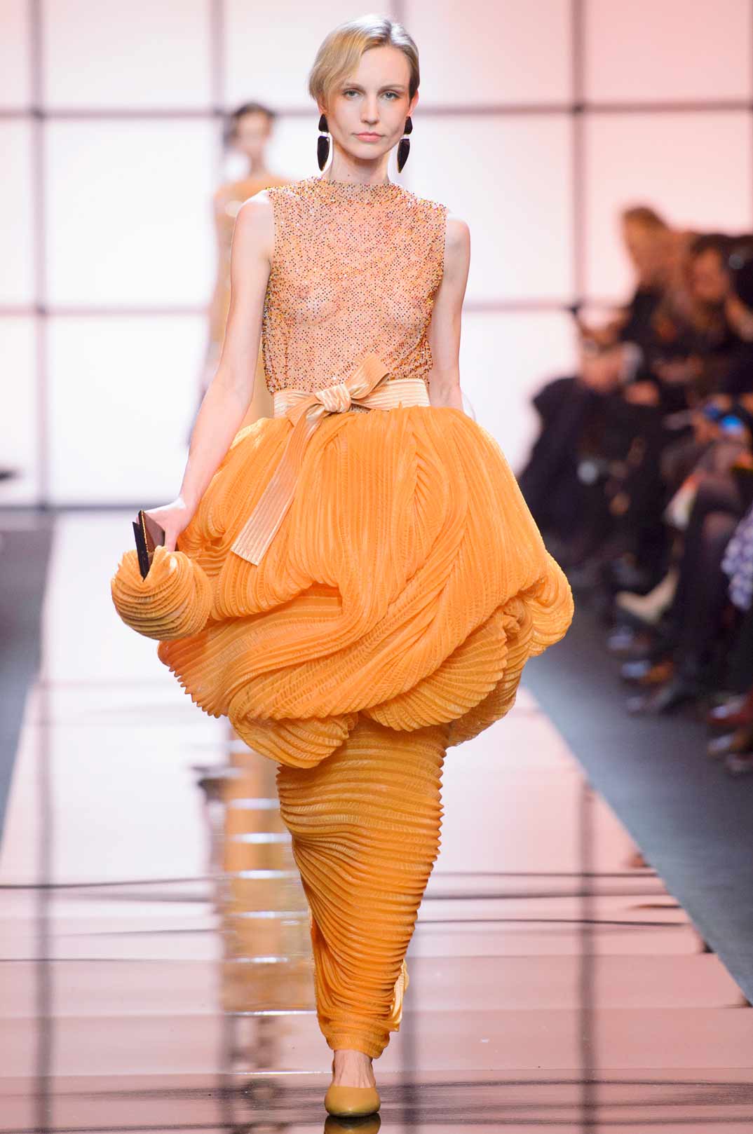 Giorgio Armani convirtió parisino Palais de Chaillot en un magnífico atardecer de verano, tiñéndolo de un cálido naranja, el color protagonista de su nueva colección de Alta Costura Primavera- Verano 2017 para Armani Privé.