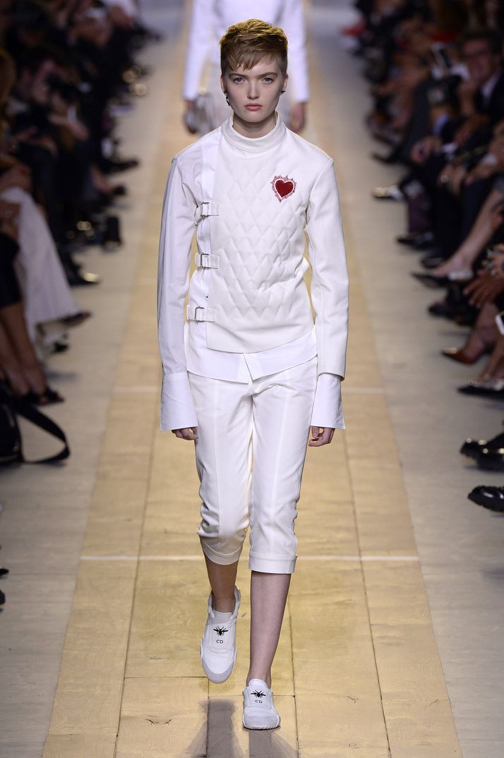 Chiuri apuesta por una mujer fuerte, guerrera y por eso vemos las vemos con versiones diferentes del traje de esgrima. Chaquetas, chalecos e incluso vestidos -siempre en blanco- llevan el pecho acolchado, como protegido. También podemos ver el estilo deportivo en prendas más sofisticadas y femeninas, con deliciosas camisas de plumeti plisadas y vestidos transparentes con volantes y tirantes de peto.