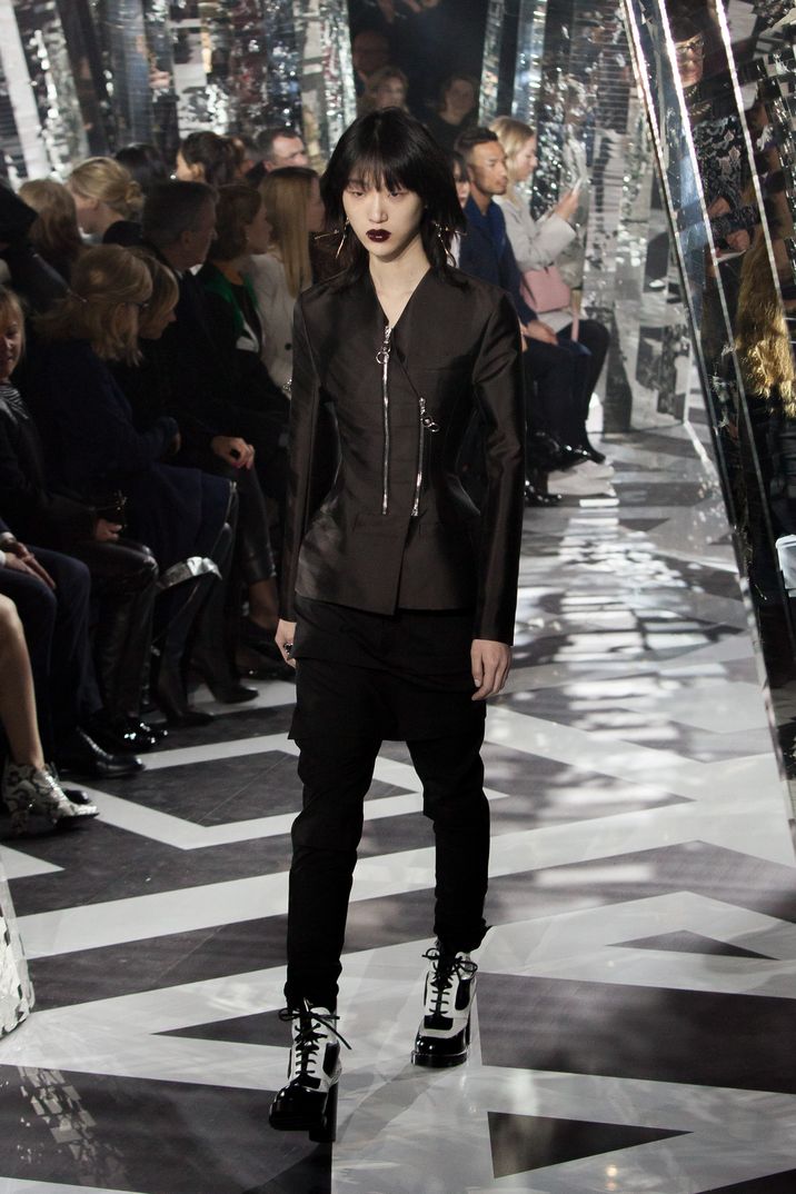 Sobre la pasarela también podemos ver los trajes de chaqueta y pantalón que dan un giro de 180º con originales aberturas en el pecho o en los hombros y unas siluetas maxi-ajustadas aderezadas en la parte inferior por cremalleras como mero accesorio decorativo.