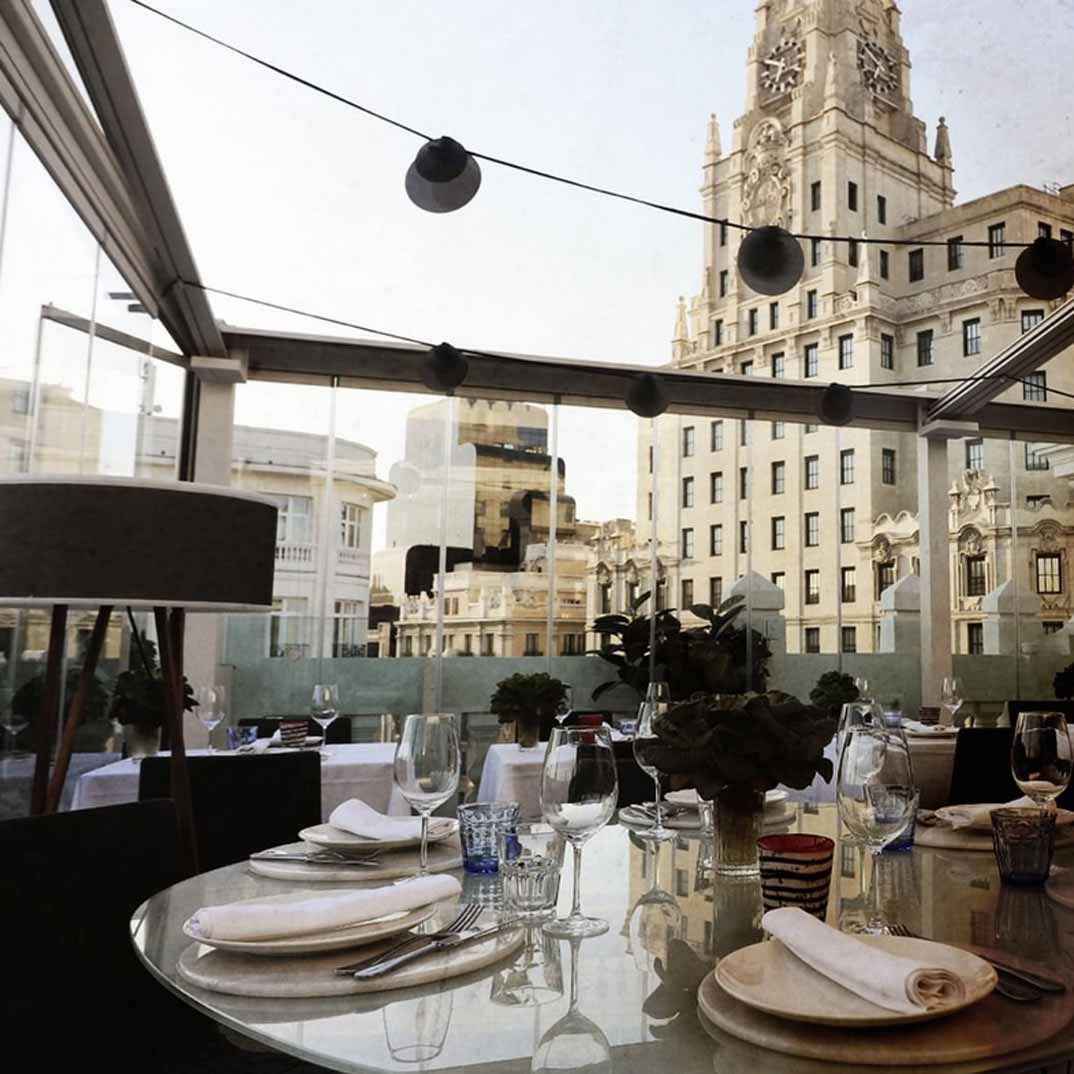 La sala, ubicada en la octava planta del hotel NH Collection Madrid Gran Vía, cuenta con las mejores vistas de la Gran Vía. Para el primer aniversario, el nuevo jefe de cocina ha querído presentar una nueva propuesta gastronómica basada en tapas y platos de lo más castizos