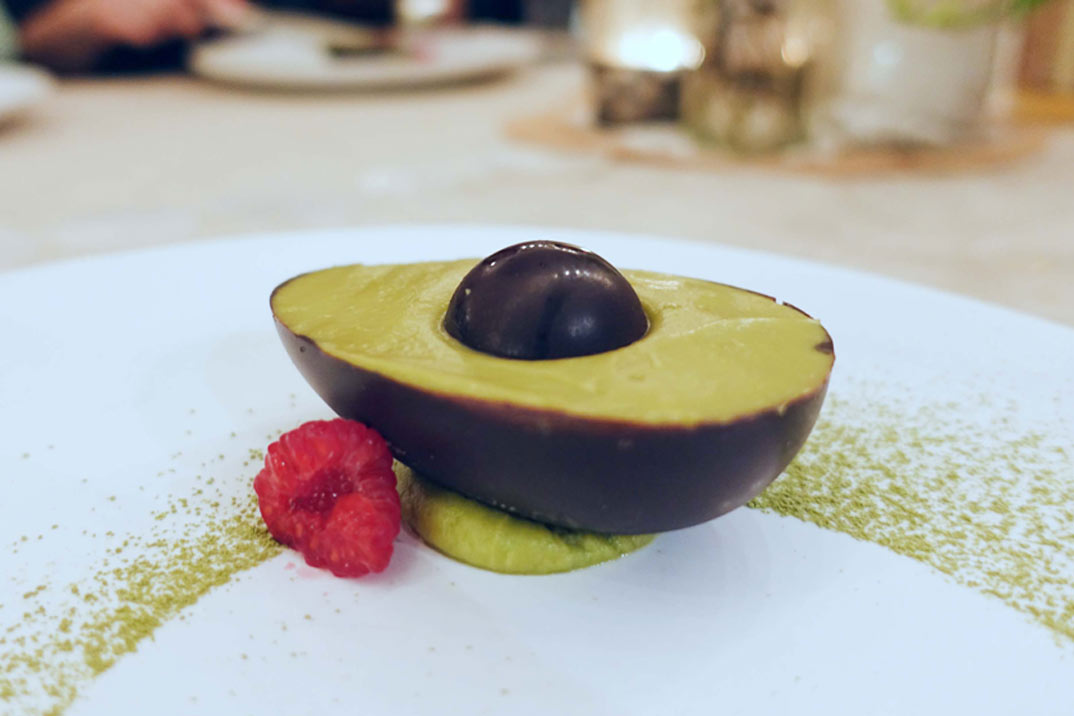 Para terminar nos pusieron un aguacate de chocolate, crema de Matcha y lima, y corazón de frambuesa y menta. ¡La crema estaba para comerse otro aguacate más!