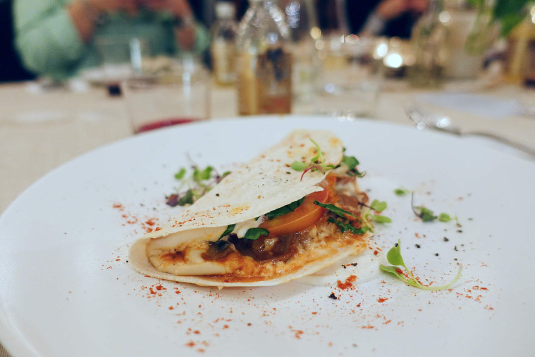 De primero nos pusieron unas Quesadillas de miso y setas con queso de anacardos fermentado, kimchi y espinacas. ¡Buenísimas! Además, las tortillas estaban hechas a mano y el sabor del queso fermentado me encantó. ¿Has probado el queso vegano hecho a base de queso? Esta fue mi segunda vez, y sí, te recomiendo probarlo en cuanto puedas.