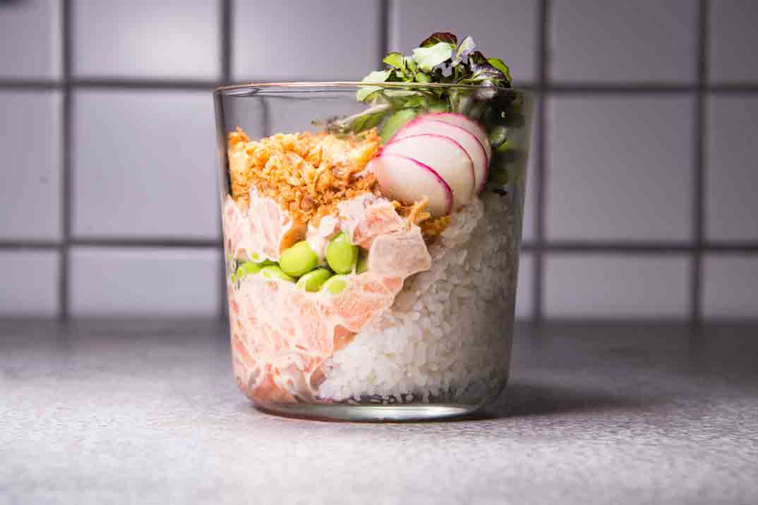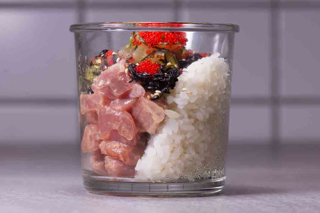 Acostumbrados a que los poke bowl se sirvan, como su propio nombre indica, en un bowl, en Pokelolo quieren darle la vuelta a lo establecido para ponérselo aún más fácil (y sabroso) al comensal. De esta manera, los productos se sirven en unos recipientes cilíndricos hondos de vidrio, un formato que permitirá que la proteína y los hidratos se repartan dentro de él de forma diagonal. Es decir, por un lado el arroz y por el otro el pescado con el resto de aderezos que incluya la receta. De esta forma, es mucho más sencillo poder comer todos los ingredientes juntos y evitar que el arroz se quede, como sucede en los bowls convencionales, en el fondo del plato.
