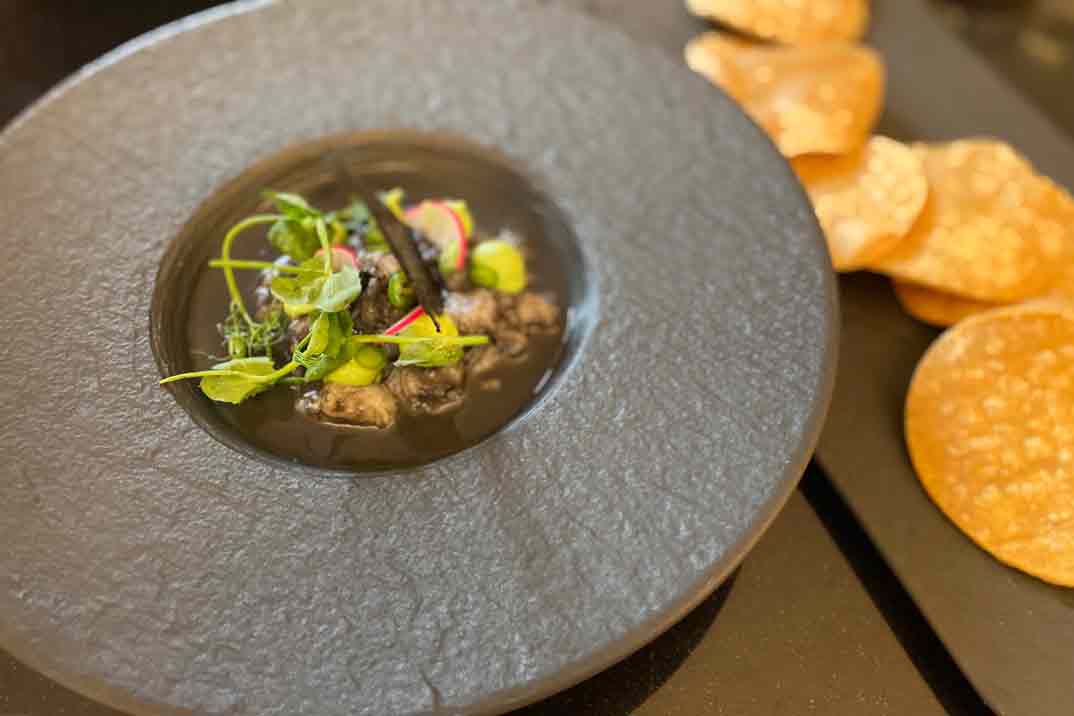 Para comenzar… «Aguachile Negro» (Camarón y vieira en salsa de recado negro, habanero, pure de aguacate y cilantro)… Plato ideado por Pedro Evia hace una década y replicado por otros cocineros en distintos lugares del mundo. Q78 ofrece una cocina singular donde muchos de los platos son fruto de cocciones largasl como las «Tortas de cochinita«, una receta de pan francés. Las tortas son elaboradas según la receta de un panadero de origen español que llegó a Yucatán procedente de Cuba hace más de 100 años.
