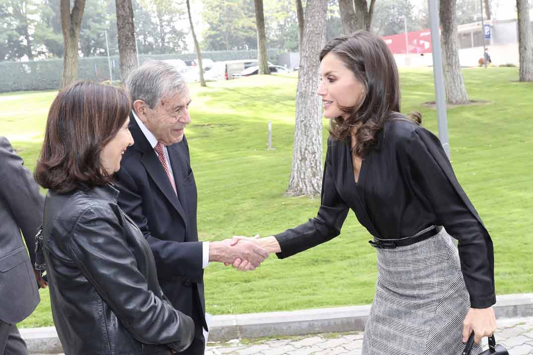 Para la ocasión, la reina Letizia ha optado por un perfecto look working girl sobrio y sencillo. Así ha rescatado de su vestidor una de sus prendas más aplaudidas: la falda asimétrica con estampado Príncipe de Gales firmada por Massimo Dutti que ha estrenó en la pasada inauguración de Fitur en febrero.