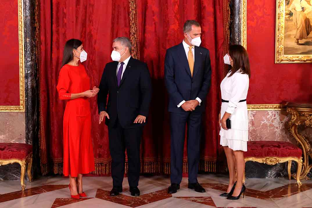 La reina Letizia recupera su vestido rojo de Massimo Dutti más comentado, en el almuerzo que los Reyes han ofrecido en el Palacio Real en honor del presidente de Colombia.