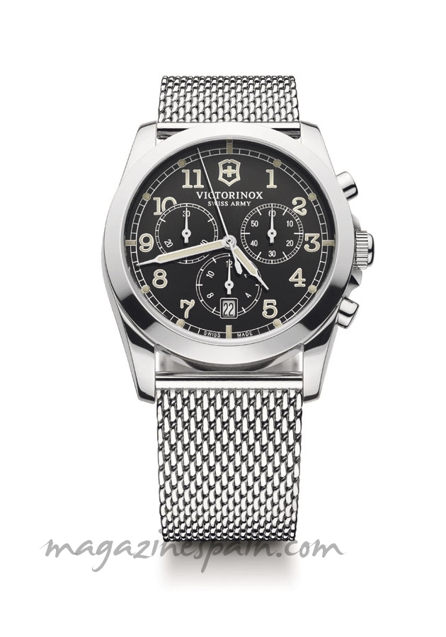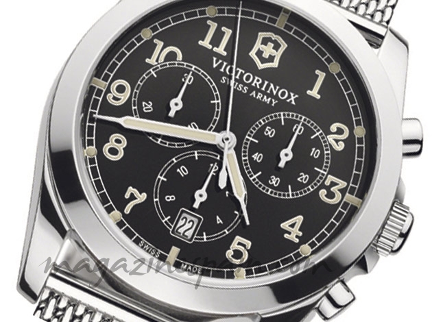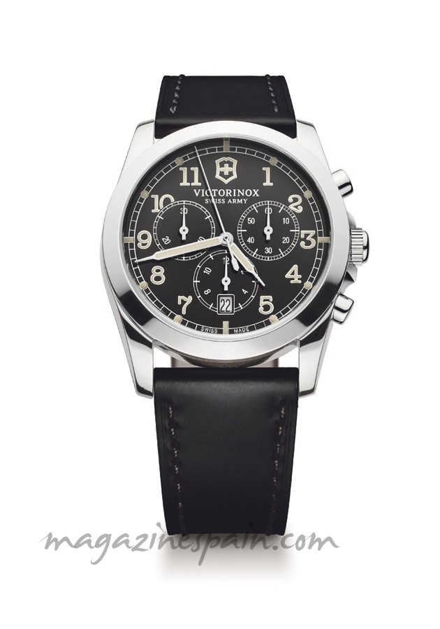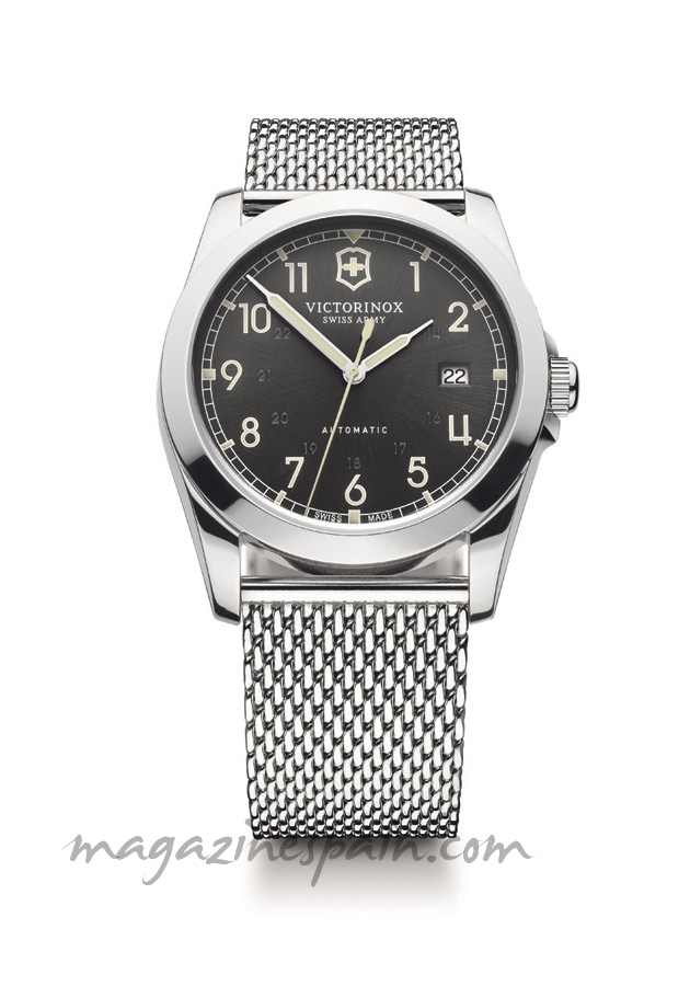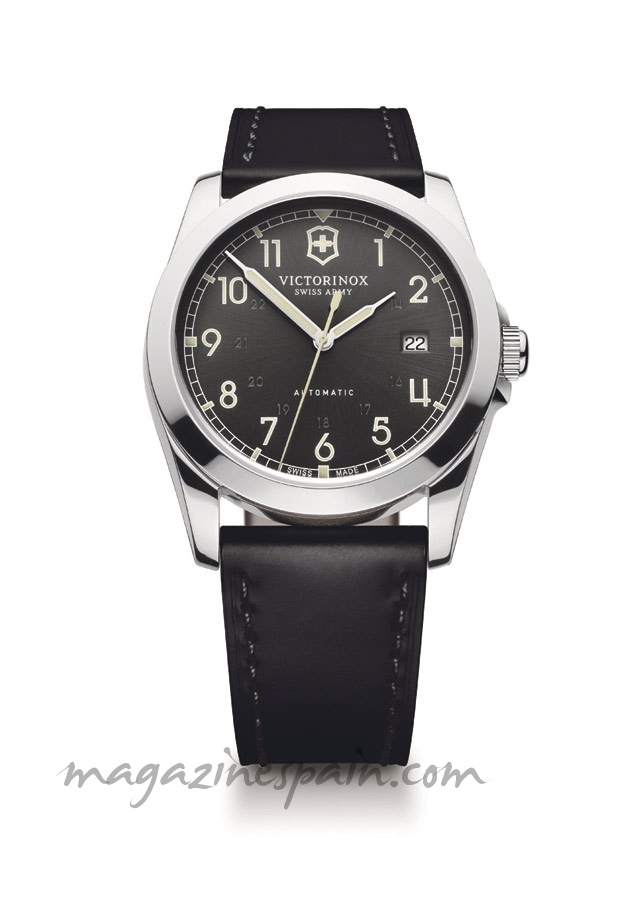 La silueta del reloj recuerda la hoja de la navaja de oficial de Victorinox. La esfera facilita la lectura de la hora, con caracteres inspirados en las máquinas de escribir, que dan un toque vintage. Las agujas se han alargado ligeramente, y por supuesto, están cubiertas de material luminiscente.