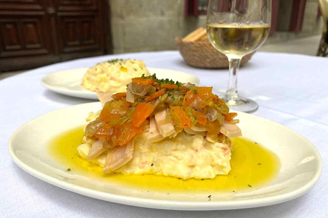Para terminar con los entrantes, probamos la «Corvina macerada al ajillo«, un plato potente y diferente y, como no, sus clásicos torreznos.