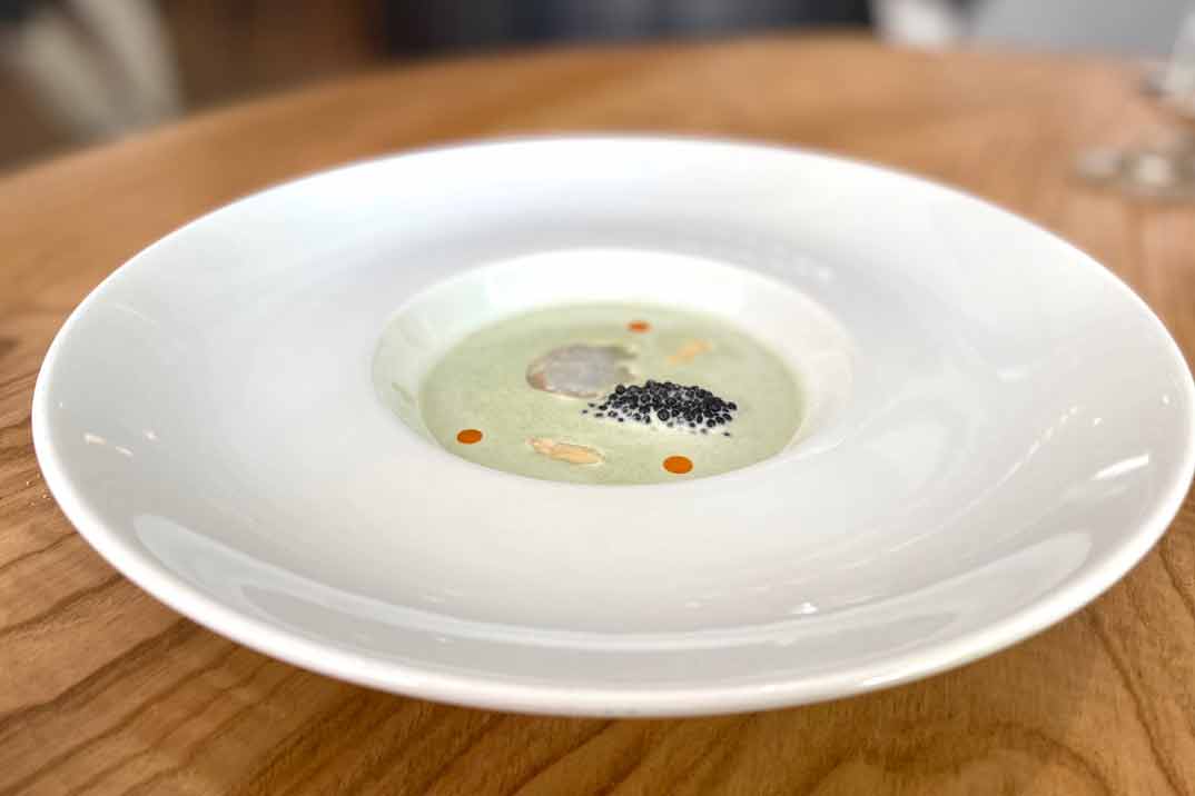 «Lomo de Jurel ahumado con salsa de pepino» y «Ajo blanco de algas con cigala, caviar, almendra y aceite de pimentón«. Después del salmorejo y el gazpacho, el Ajo Blanco es sin duda una de mis sopas frías favoritas y con la cigala y el caviar… ¿Qué os puedo decir?… ¡Riquísimo!