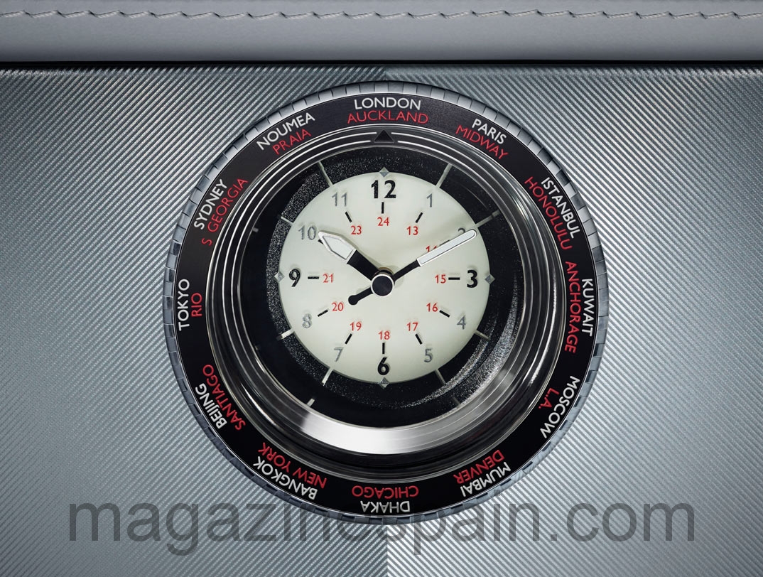 Llama la atención, el reloj analógico del salpicadero, que incluye los nombres y zonas horarias de 24 de la mayores ciudades del mundo.