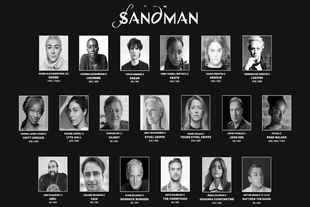 Tom Sturridge (The Hollow Crown) es Sueño, protagonista principal de la serie. Lo acompañan Jenna Coleman (Doctor Who, Victoria) como Johanna Constantine, Gwendoline Christie (Juego de Tronos) en el papel de Lucifer, Kirby Howell-Baptiste (Killing Eve) como Muerte, mientras que Sanjeev Bhaskar y Asim Chaudry serán Caín y Abel.
