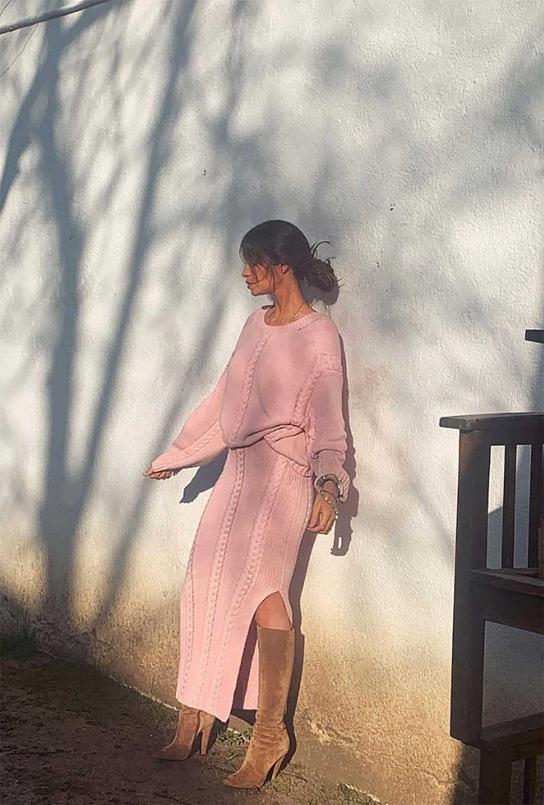 Completando su estilismo, Sara ha elegido unas botas altas de ante en marrón, que estilizan su figura. Un calzado básico y atemporal, que son ideales para combinar tanto con vestidos de aires hippies en el invierno o con un conjunto tan impecable como este en rosa empolvado.