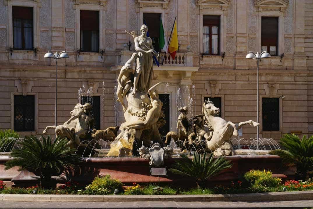 Lo primero que vimos fue la Plaza Duomo, impresionante por su belleza, donde predomina claramente el estilo barroco con el Palazzo Municipale y el Palazzo Arcivescovile (Arzobispal). En el centro se ubica la Catedral, el mejor ejemplo de mezcla de estilos arquitectónicos en Siracusa. La segunda parada es la Plaza de Arquímedes, dedicada a su más ilustre ciudadano y rodeada de palacios señoriales de estilo gótico catalán. Tiene en su centro la fuente de Artemisa.