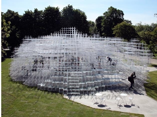 El arquitecto japonés Sou Fujimore ha creado una espectacular reja irregular con barras blancas de acero que ocupan una superficie de 541 metros cuadrados donde el público podrá interactuar con el espacio como nuevo pabellón temporal de la Serpentine Gallery de Londres en los jardines de Kesington.