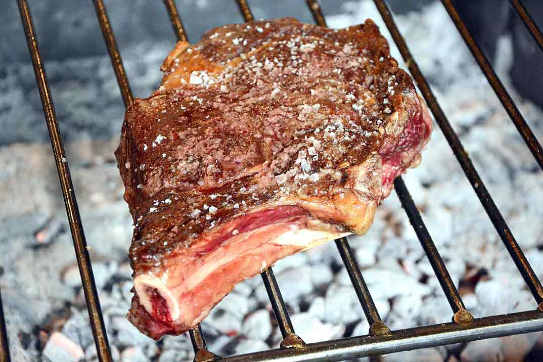 Para llegar al tercer salón, atravesamos un pasillo custodiado a ambos lados por la cocina que sirve a todo el restaurante. Ahí, en medio del espacio, se encuentra a la vista la parrilla de carne y verduras.