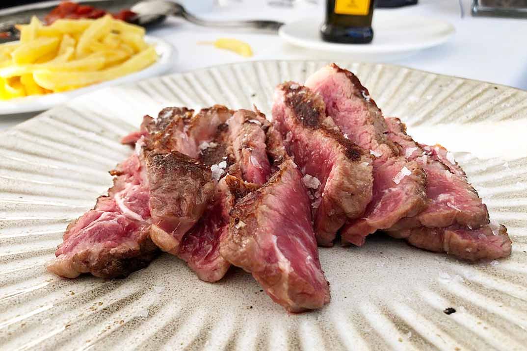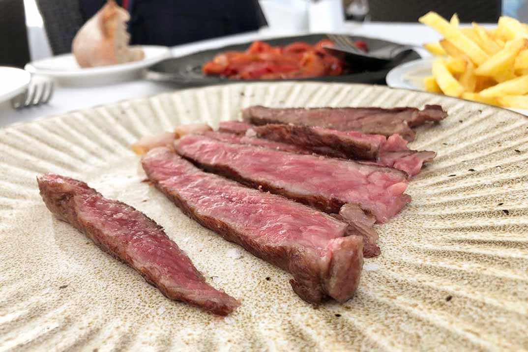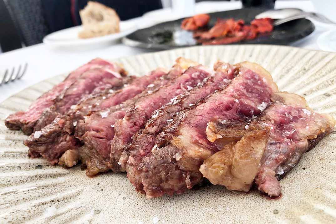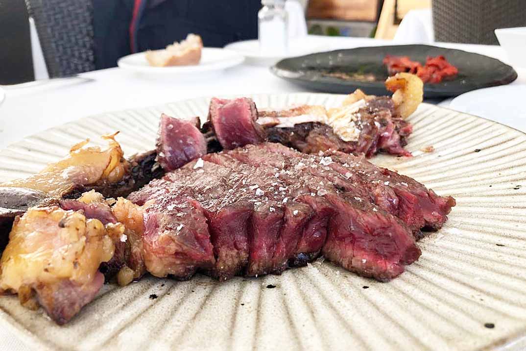 4. Rubia Gallega: Nacional o del norte de Portugal. Con más de 5 años de edad, maduradas en sus instalaciones aproximadamente entre 90-180 días. Ambas carnes maridadas con un «Hisenda miret». Un garnacha del 2016 del Penedés.