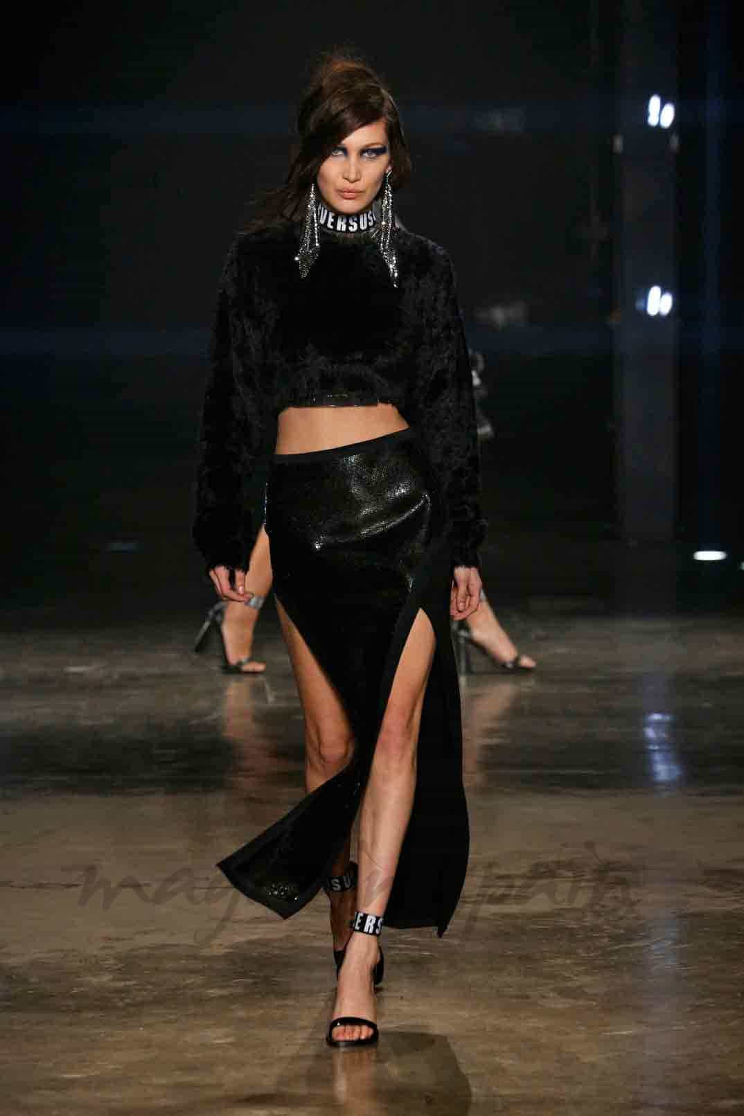 Sobre un escenario muy oscuro y con gran protagonismo de los tonos negros y azules eléctricos, Donatella Versace presentó su nueva colección con un desfile muy andrógino de la mano de las hermanas top models del momento Gigi Hadid y Bella Hadid.