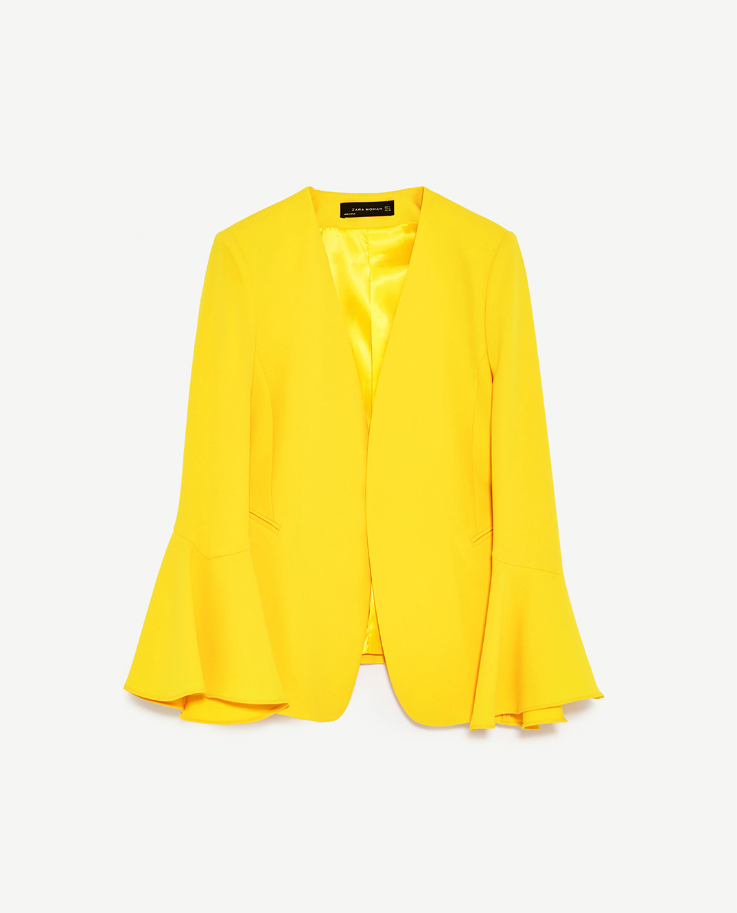 Y para terminar, un conjunto perfecto si eres morena. La combinación con elementos en negro aporta cierta serenidad, dando además movimiento a través de los volantes de las mangas de la chaqueta.
